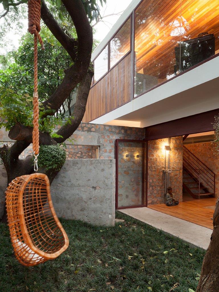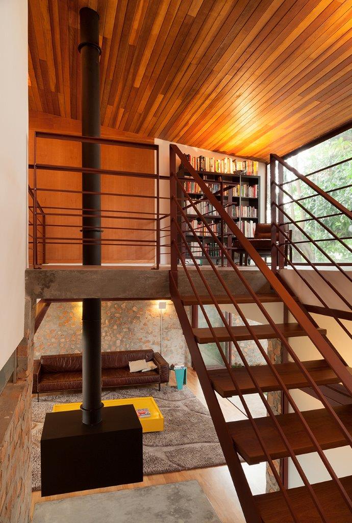 A conexão entre os pavimentos é marcada por uma nova escada e também pelo vazio residual da antiga escada. Consequentemente, a casa acaba por receber uma maior incidência de luz e ventilação natural.