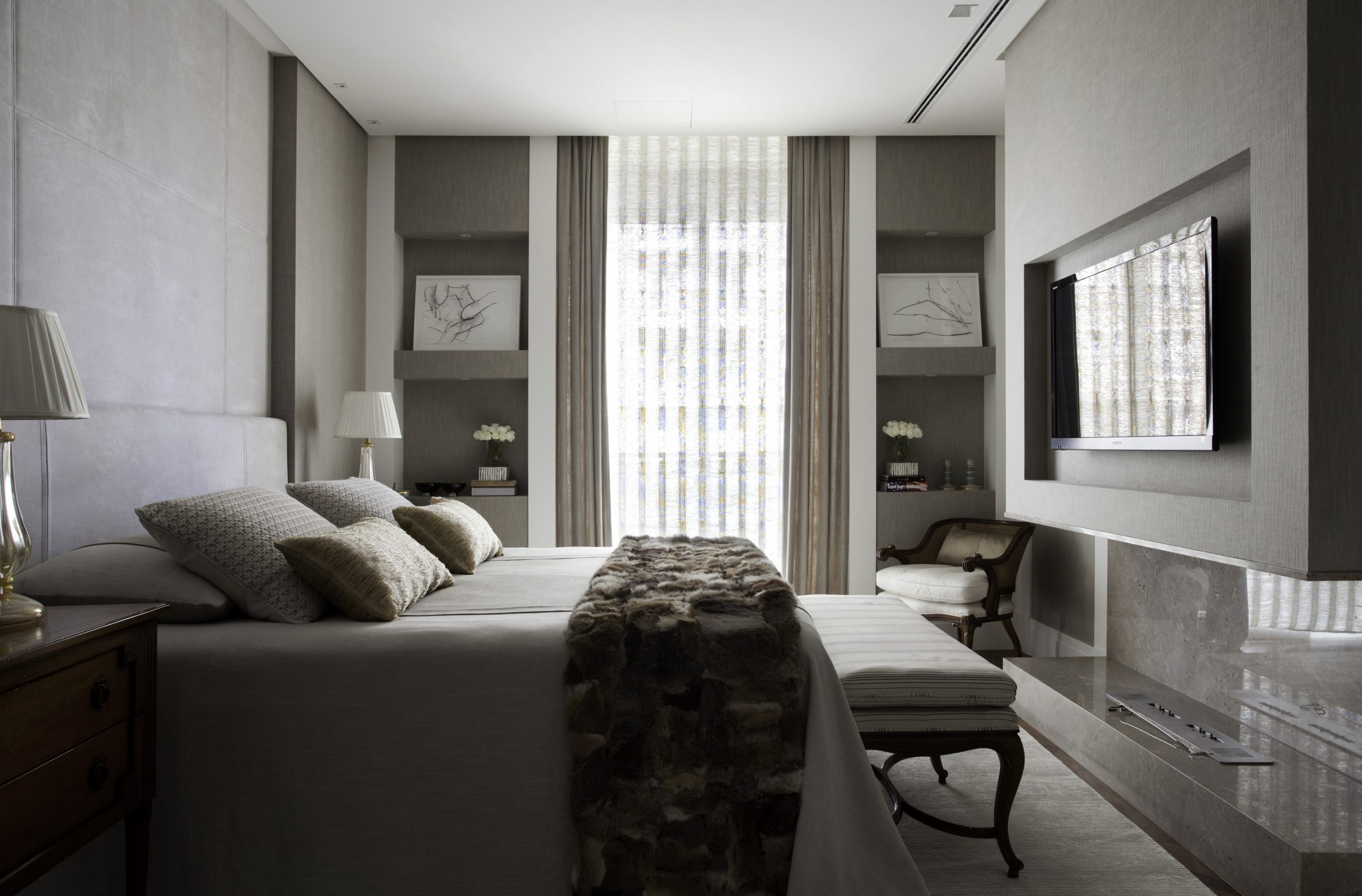O quarto é sempre sinônimo de descanso e quando somado a lareira, o conforto e a comodidade só aumentam. Nesse projeto das arquitetas Andrea Teixeira e Fernanda Negrelli, o aparato foi inserido de modo minimalista logo abaixo do aparelho televisivo, conferindo um ar sofisticado e harmônico ao local.