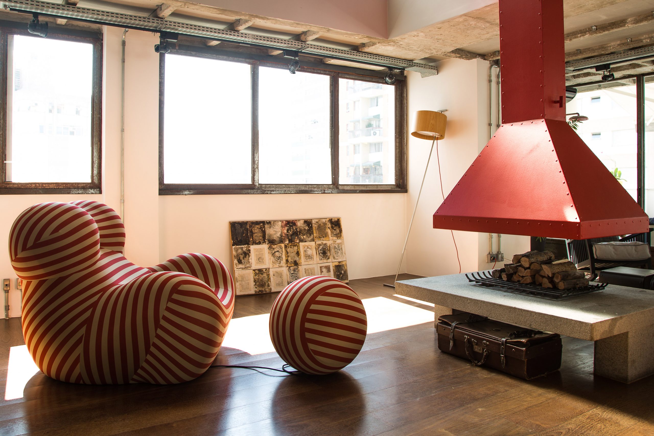 O duto desta lareira já fazia parte do living da residência antes da modificação do design de interiores. Por ser uma parte querida da cliente, a Drops Arquitetura o manteve, o tornando um item essencial para imprimir no projeto a ideia de loft industrial.
